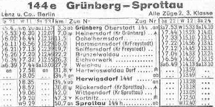 W czasie I i II wojny światowej z usług kolejki korzystało wojsko z garnizonów w Szprotawie, Żaganiu i Kożuchowie. Do lata 1914 r. ze stacji wyjściowej w Zielonej Górze, linię obsługiwały trzy składy osobowo – towarowe na dobę (w 1913 roku przewieziono 113 164 osoby). W soboty i niedziele uruchamiano dodatkowy skład osobowy do stacji Broniszów (Brunzelwaldau). Ruch osobowy jednak systematycznie malał. W 1929 roku przewiziono 50 122 osoby. W tym też roku spółka po raz pierwszy odnotowała stratę ([w:] M. Zarzycki). Na przełomie października i listopada 1930 roku z powodu powodzi i podmycia torowiska między Ochlą a Broniszowem nie kursowały pociągi, co także wpłynęło na kondycję finansową spółki. W rozkładzie jazdy z 1935 roku do Szprotawy dojeżdżała tylko 1 para pociągów. W 1938 r z usług Lenza u. Comp. skorzystało 9 309 pasażerów (spadek o 90%). Prawdopodobnie spadek przewozów był spowodowany systematycznym pogarszaniem się infrstruktury kolejowej. Czas jazdy wydłużał się, co mogło zniechęcać ludzi do podróżowania. W czasie II wojny rozkład jazdy był jeszcze publikowany, ale jak podkreślają badacze (m. Jerczyński oraz M. Zarzycki) o planowym rozkładzie nie mogło być mowy. Wiadomym jest, że z torów korzystało wojsko przewożąc towary na potrzeby militarne.